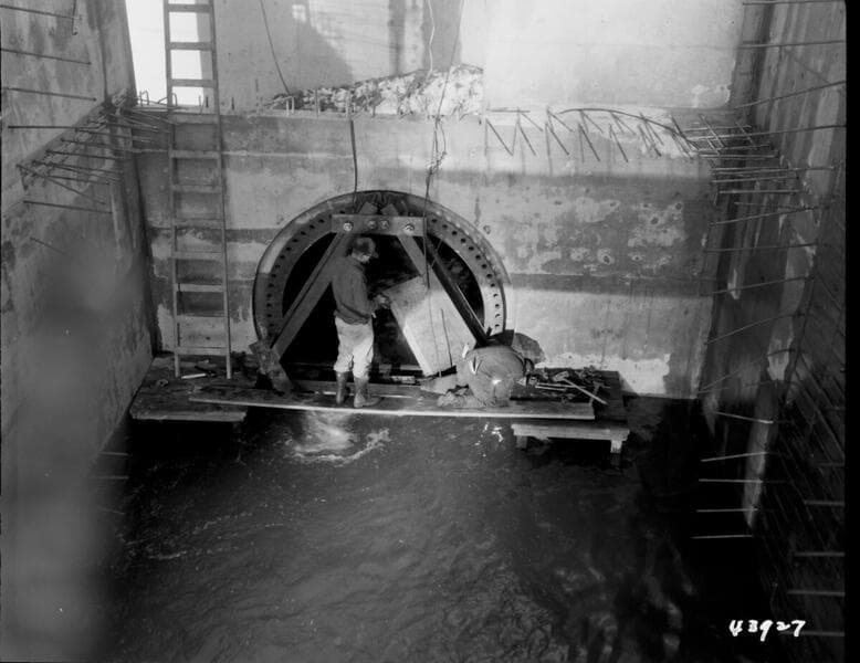 Portal Powerhouse - 12' diameter pipe installed to reduce pressure at portal during high flows. At time, the lower baffle was still there at outlet restricting end area.