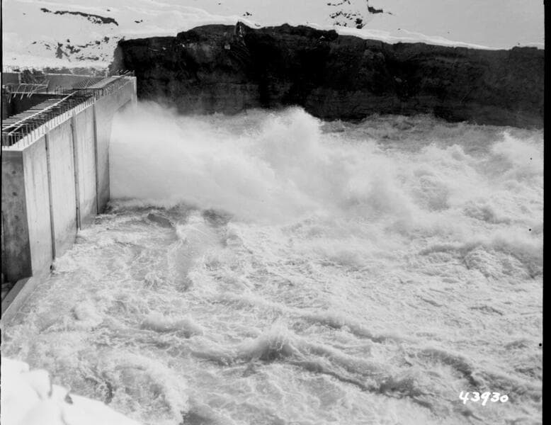 Portal Powerhouse - General view shows water leaving spray chamber at approximately 1000 cfs.