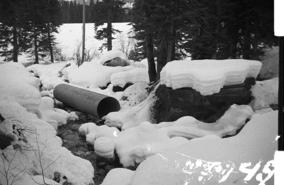 Portal Powerhouse - Intake Channel erosion thru blanket and blanket protection since placement in 1955. [stream measurement station & weir]