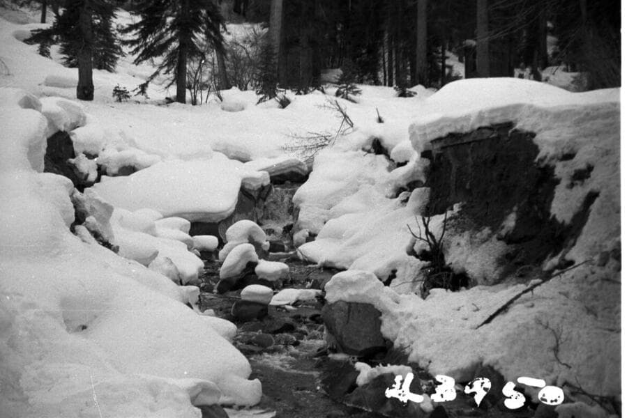 Portal Powerhouse - east erosion to road - shows 10' deep channel eroded by Camp Creek east.