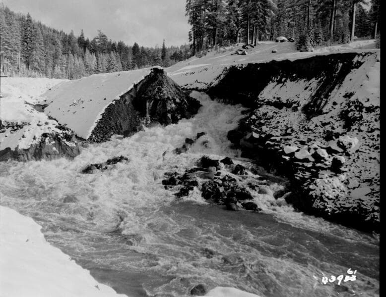 Portal Powerhouse - View of tunnel diversion during test flow of 490 cfs. Flow in diversion ditch from 12' pipe to junction with Rancheria Creek channel.
