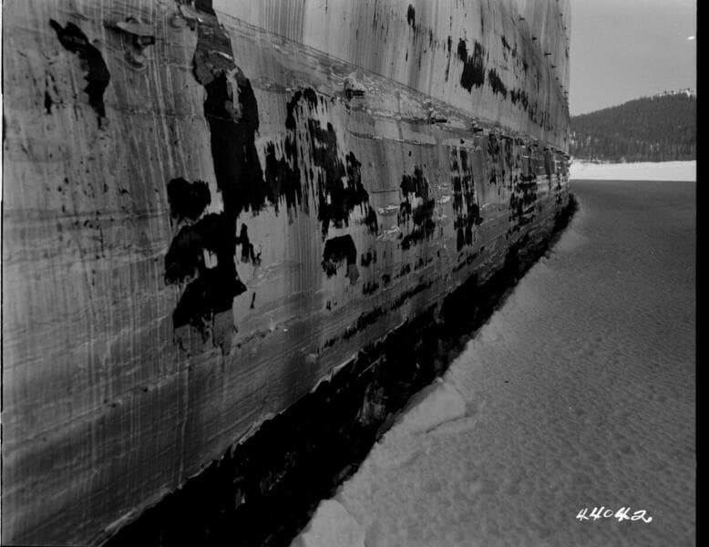 Big Creek, Huntington Lake Dams - First work along bottom of steel facing at elevation 6850. Water approx. elev. 6849.