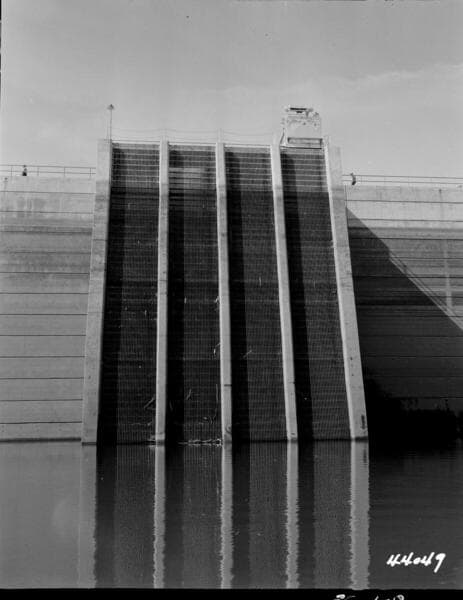 Big Creek, Huntington Lake Dams - Dam 1 Upstream face - Close-up of 9' Intake Gate trash rack to Tunnel #1. Water elevation 6847