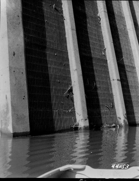 Big Creek, Huntington Lake Dams - [not Huntington Lake - shot is of Dam 7 and Redinger Lake] - View of exposed portion of tunnel intake trash rack.