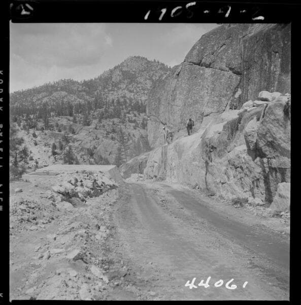 Big Creek, Vermilion Dam - North below 7550 berm station 19+00, 3 trenches, 6' wide by 5' deep, 60' long. Note man standing [in trench] to right.