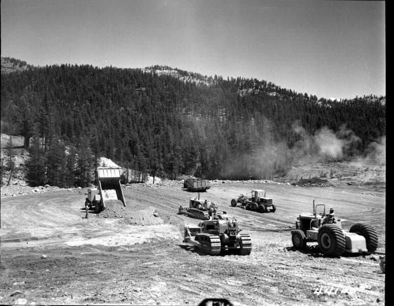 Big Creek, Vermilion Dam - Downstream slope of Vermilion Dam in vicinity of Sta[tion] 37+00 near east end showing group of Piezometer & Drain holes installed in 1956.