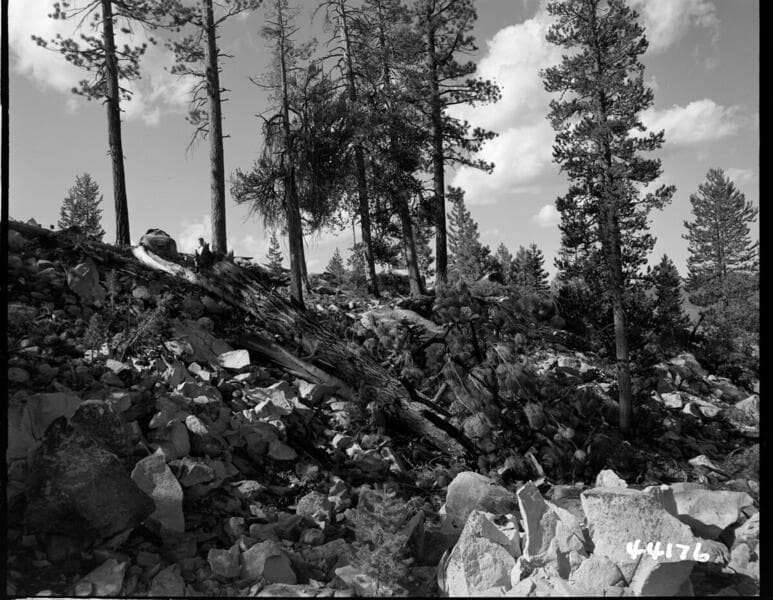 Big Creek, Vermilion Dam - West along axis from east abutment. Haul road in foreground at el[evation] 7650. Rodman is at junction of service spillway and axis.