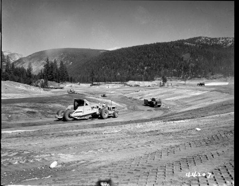 Big Creek, Vermilion Dam - Compacting select backfill in Service Spillway Channel.