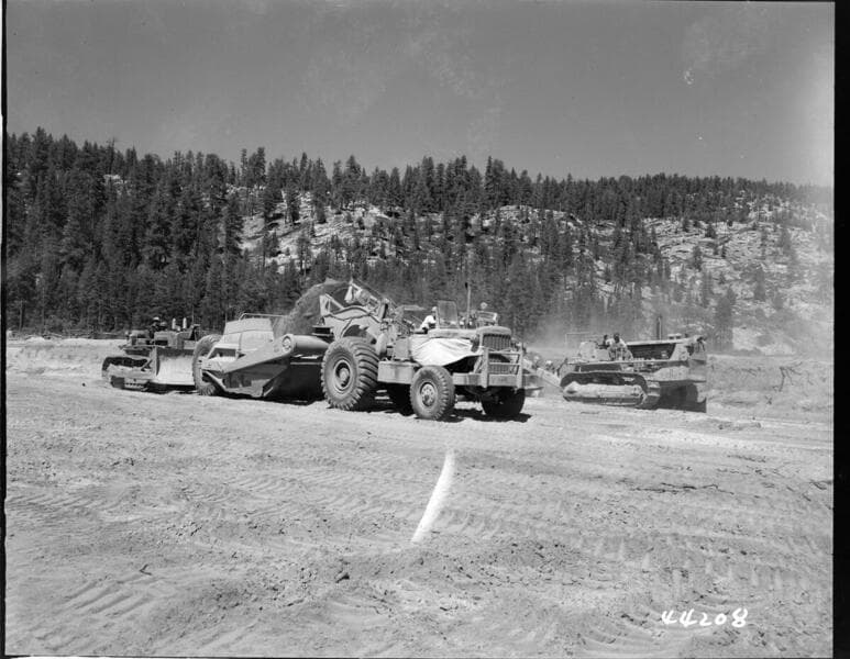 Big Creek, Vermilion Dam - Push Cat loading carryall in Borrow Pit #4.