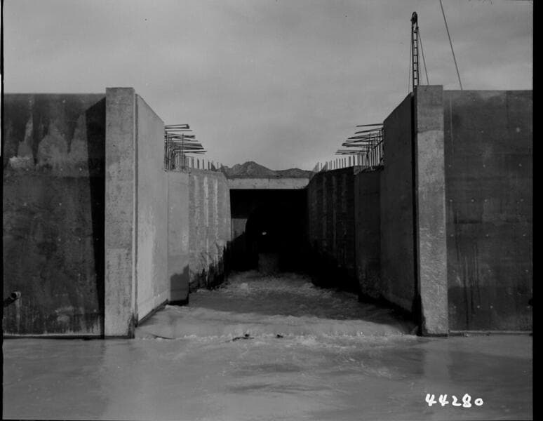 Big Creek, Vermilion Dam - Vermilion cliffs in background and stilling basin.