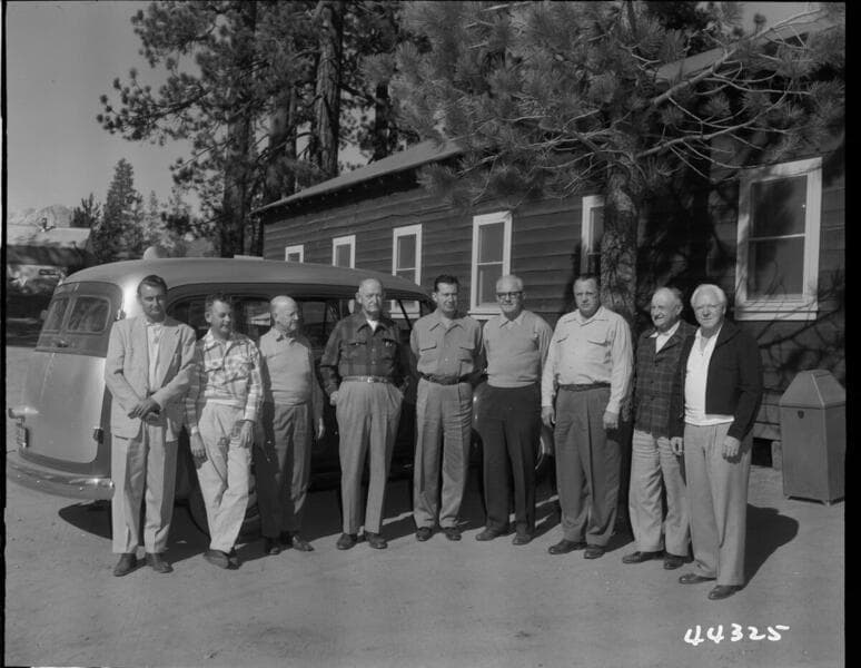 Big Creek, Vermilion Dam - Mr. McWhinney [center in v-neck sweater]with group of men [outside Bechtel Field Office].