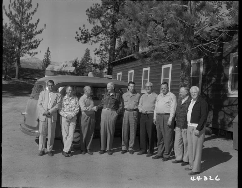 Big Creek, Vermilion Dam - Mr. McWhinney [center in v-neck sweater]with group of men [outside Bechtel Field Office].