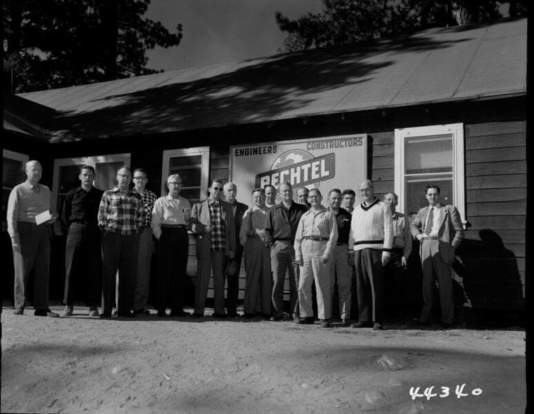 Big Creek, Vermilion Dam - Mr. McWhinney [center in v-neck sweater]with group of men [outside Bechtel Field Office].