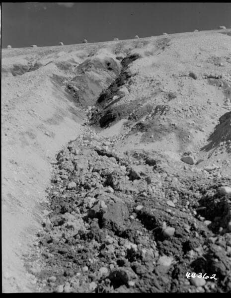 Big Creek, Vermilion Dam - Storm damage to downstream slope. Center of photo approx. 15+00.