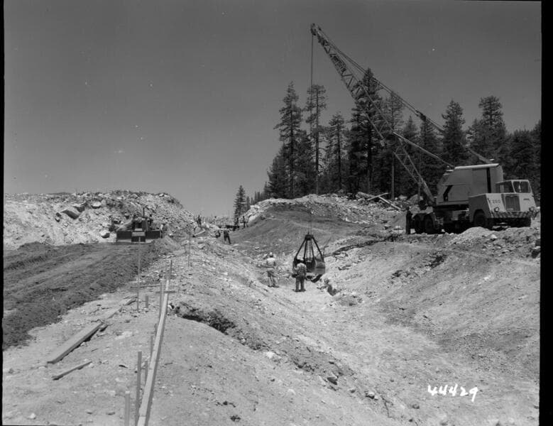 Big Creek, Vermilion Dam - Looking south along east abutment. Man in same place as #1 looking upstream along center line of service spillway. Note upper haul road on extreme left.