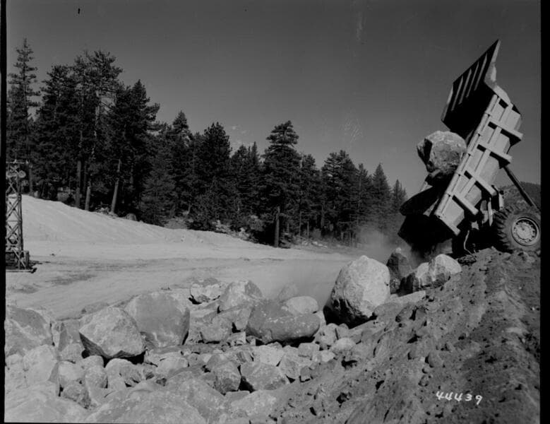 Big Creek, Vermilion Dam - Placing wave protection blanket of gravel over emergency spillway.