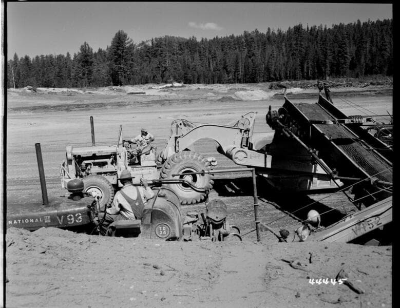Big Creek, Vermilion Dam - Loading Carryalls with Sierra Loader [in] Borrow Pit #4.