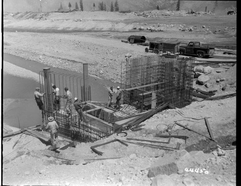 Big Creek, Vermilion Dam - Placing reinforcing steel in inlet structure.