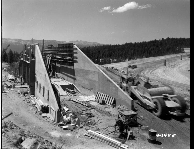 Big Creek, Vermilion Dam - El[evation] 7650 east abutment showing cleared strip for service spillway chute. Rodman is at toe of dam east of service spillway.