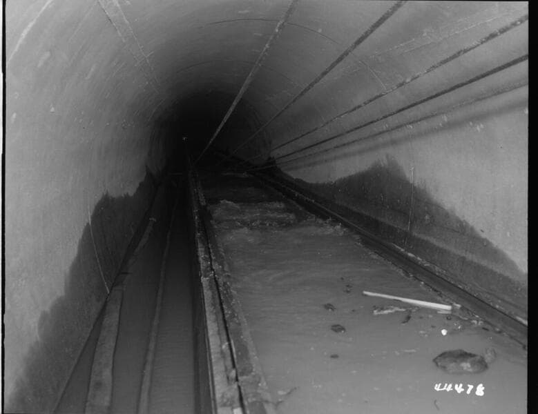 Big Creek, Vermilion Dam - Welding rail to curb in control conduit. Stream flow 40 cfs.