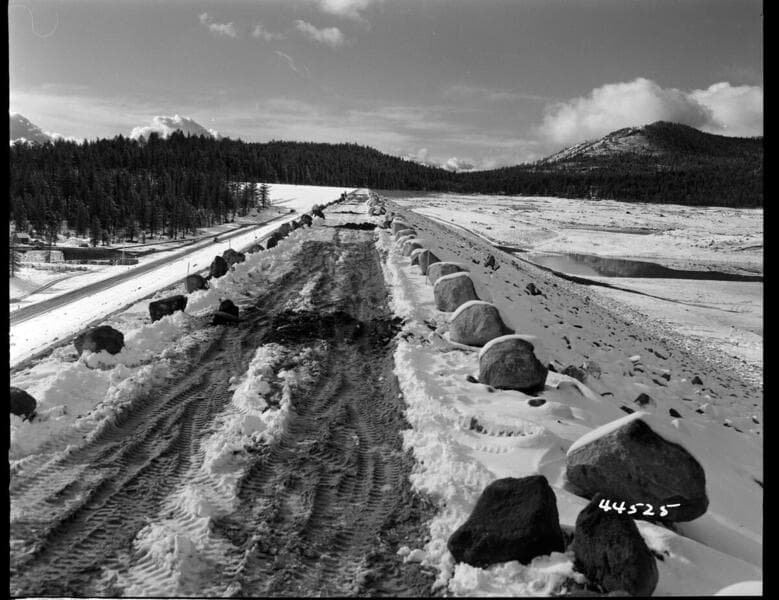 Big Creek, Vermilion Dam - Looking east along crest of dam [covered with snow] from point near east abutment.
