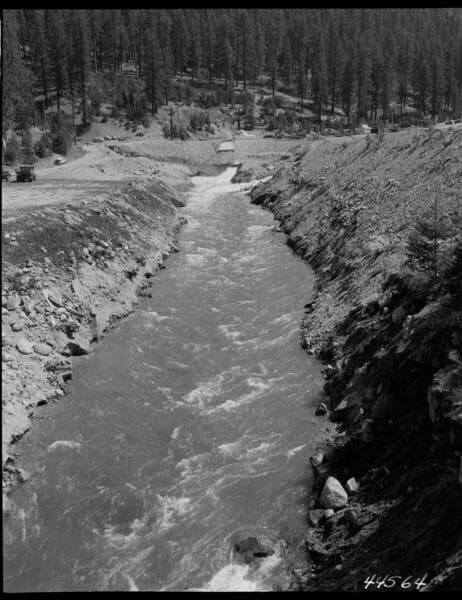 Portal Powerhouse - View of tunnel diversion during test flow of 490 cfs. Flow in diversion ditch from 12' pipe to junction with Rancheria Creek channel.