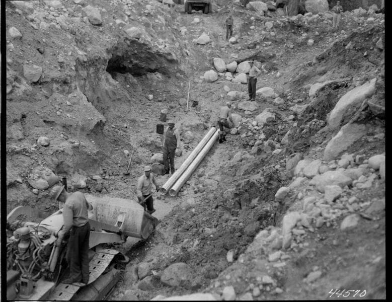 Big Creek, Vermilion Dam - Aux[iliary] Drain #2. Placing gravel over 8" [perforated] pipe.
