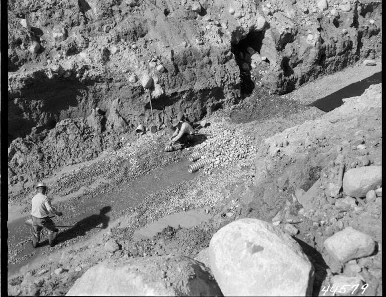 Big Creek, Vermilion Dam - Aux[iliary] Drain #2. Due to rapid sealing up of gravel & sand cover around 1st section of pipe.