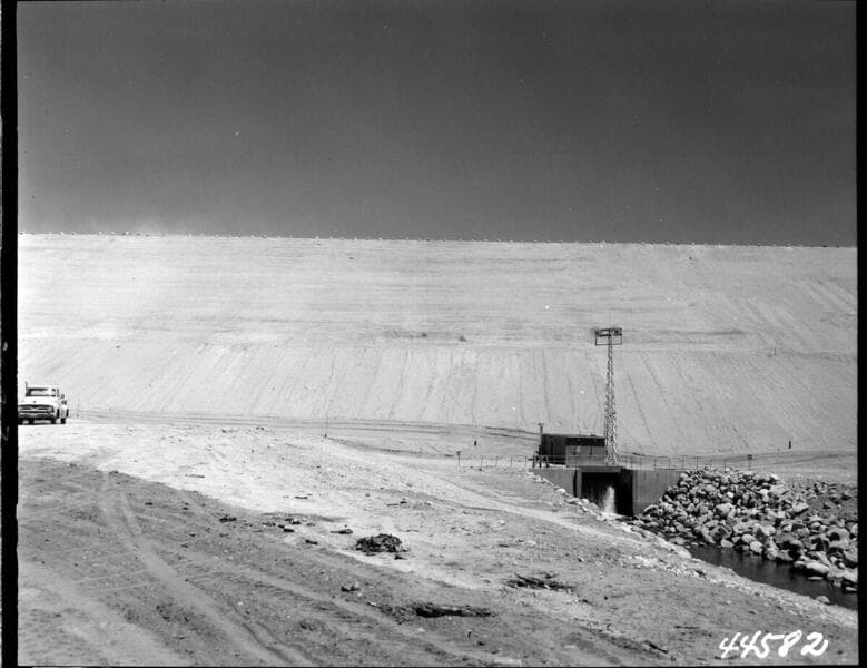 Big Creek, Vermilion Dam - View of downstream face of dam showing downstream slope protection and outlet works discharge channel.