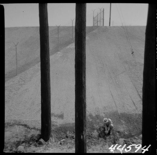 Long Beach Steam Station - Discharge Conduit - looking north on dike near transformer house showing cracks caused by settlement of inland slope.