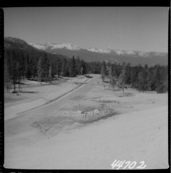 Big Creek, Vermilion Dam - Downstream slope of Vermilion Dam in vicinity of Sta[tion] 37+00 near east end showing group of Piezometer & Drain holes installed in 1956.