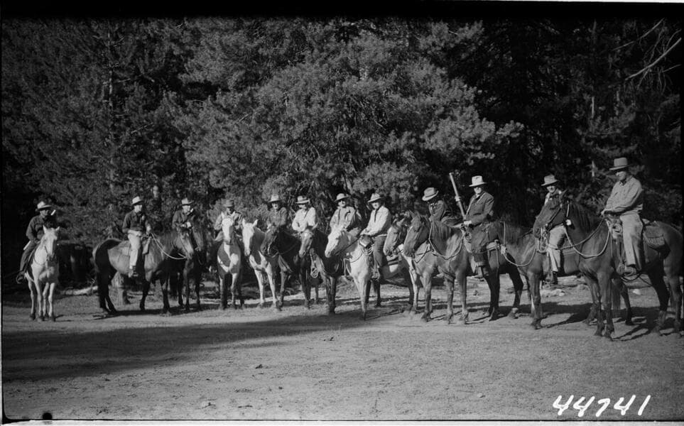 Big Creek Scenery - Party leaving McClure Lake [12 men on horseback].