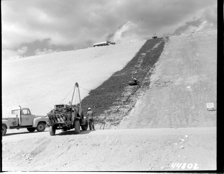 Vermilion Dam - Experimental erosion control areas on downstream slope of dam.