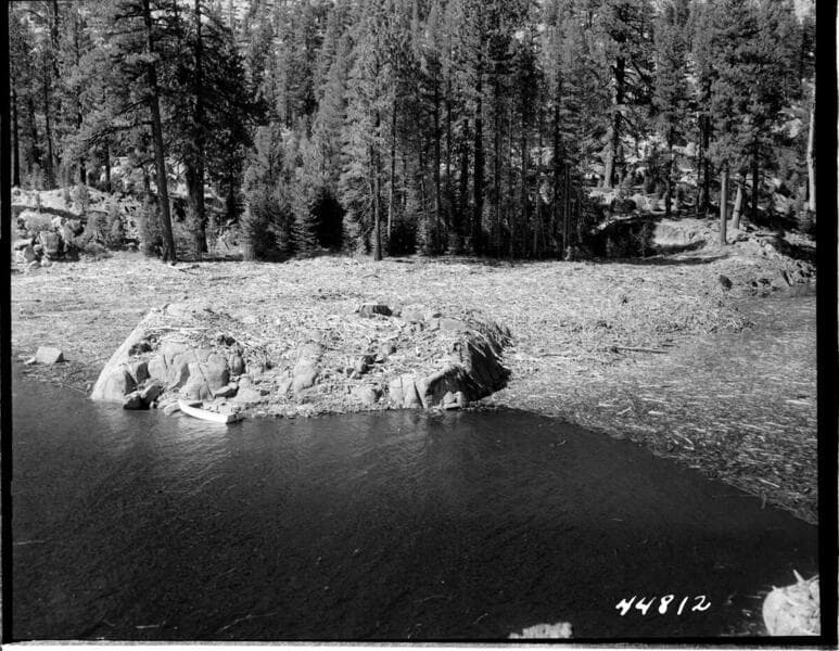 Big Creek, Vermilion Dam - First of four pictures showing debris deposited along shoreline at upper end of lake, due to recent drawdown Mono Creek where it enters lake at present water elevation - approx[imately] 7632'.