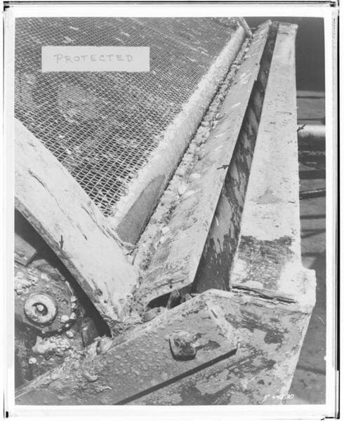 Power Producers - Not SCE - San Diego Gas & Electric Co. - Close-up of unprotected circulating water screen [from the cooling water intake system at a steam plant - protection appears to be related to corrosion of the rotating screen assembly].