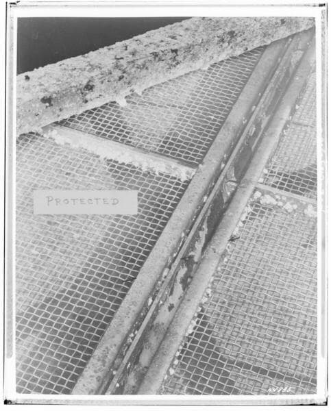 Power Producers - Not SCE - San Diego Gas & Electric Co. - Close-up of unprotected circulating water screen [from the cooling water intake system at a steam plant - protection appears to be related to corrosion of the rotating screen assembly].