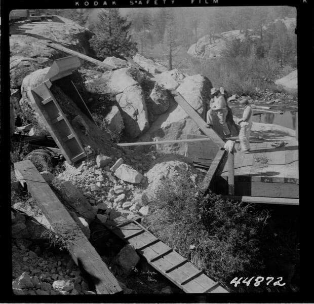 Big Creek, Vermilion Dam - Bridge construction across San Joaquin River at Mono Hot Springs.