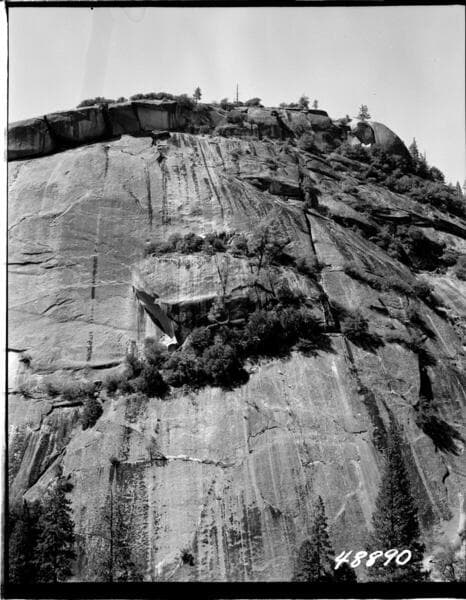 Big Creek, Vermilion Dam - West along axis from east abutment. Haul road in foreground at el[evation] 7650. Rodman is at junction of service spillway and axis.