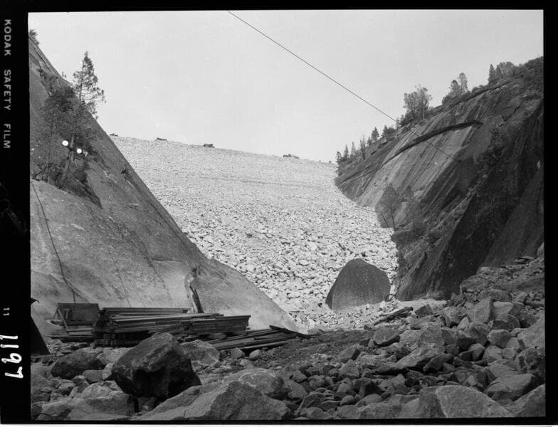 Big Creek - Mammoth Pool - General view - diversion tunnel outlet and downstream dam face.