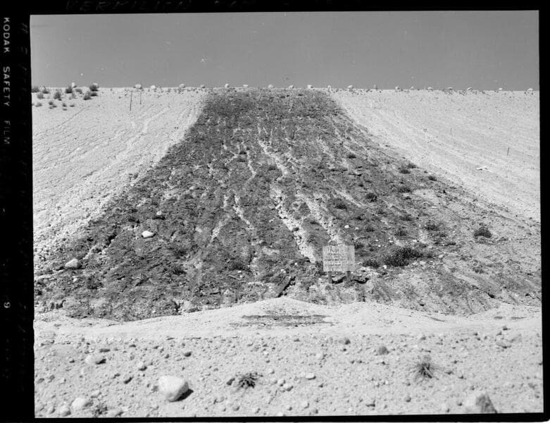 Big Creek, Vermilion Dam - El[evation] 7650 east abutment showing cleared strip for service spillway chute. Rodman is at toe of dam east of service spillway.
