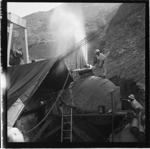 Big Creek - Mammoth Pool - [Engineers bleeding water pressure at penstock? during construction at powerhouse]