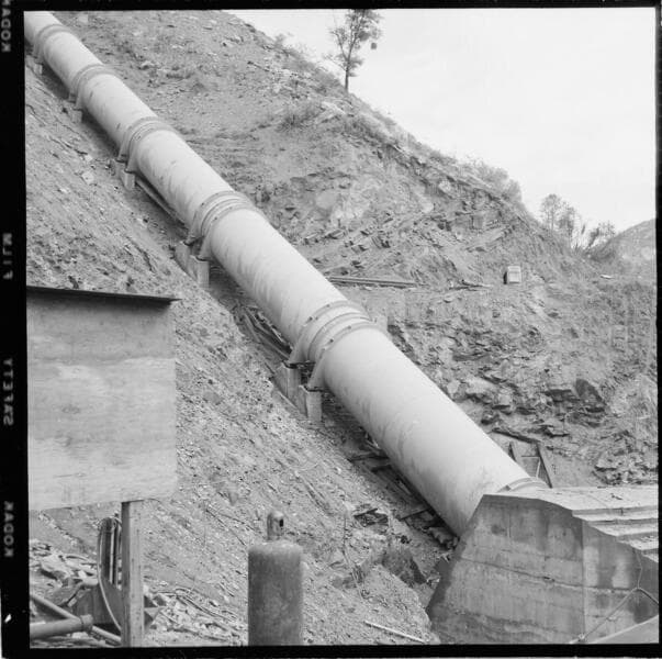 Big Creek - Mammoth Pool - [Engineers bleeding water pressure at penstock? during construction at powerhouse]