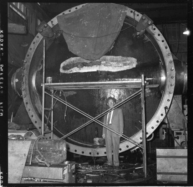 Big Creek - Mammoth Pool - [Engineers working with large penstock Butterfly Valve]