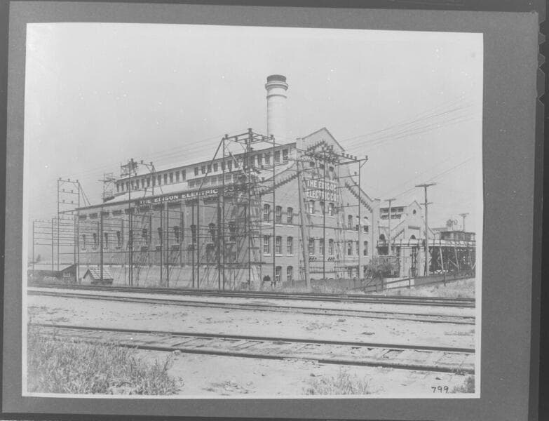 Front view of Los Angeles #3 Steam Plant, showing railroad tracks in the foreground.