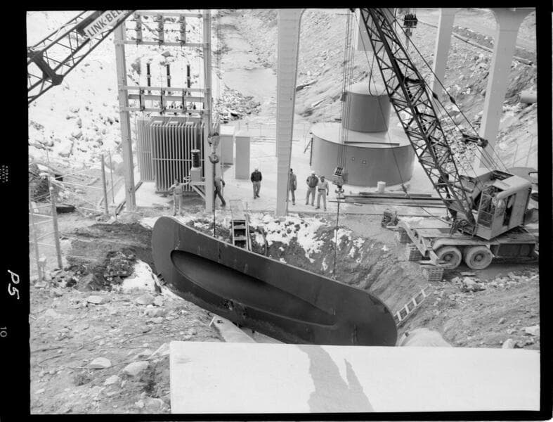 Big Creek - Portal Powerhouse - [Modified penstock split-section being lifted into place with crane and installed?]