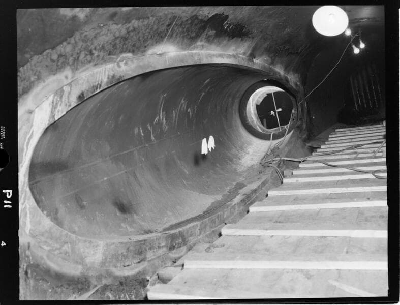 Big Creek - Portal Powerhouse - [Welded modified penstock split-section - interior view.]