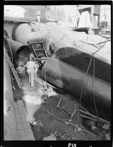 Big Creek - Portal Powerhouse - [Exterior view of modified penstock split-section in place. Workers welding and grinding joints smooth]