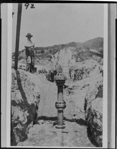Lytle Creek Hydro Plant while under construction of Penstock. Trench for pipeline at upper left. Pipe sections stored prior to assembly in middle ground.