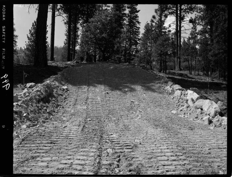 Big Creek - Mammoth Pool - Spreading downstream slope protection material.