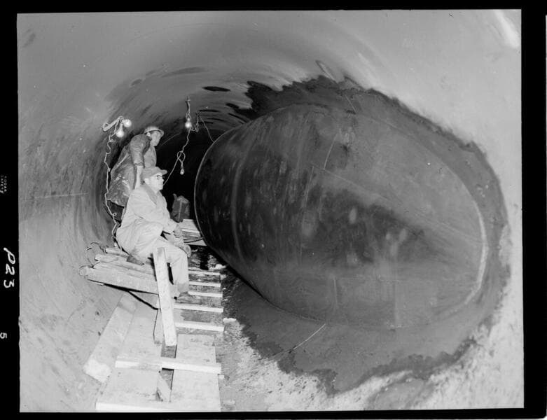 Big Creek - Portal Powerhouse - [Interior view of modified penstock split-section in place. Workers welding and grinding joints smooth]